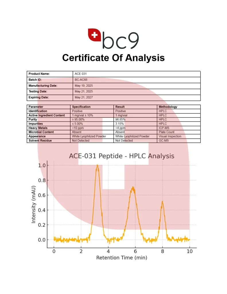 Each ACE 031 vial contains a precisely measured quantity of ACE 031, a research peptide investigated for its role in musculoskeletal and metabolic research. The product adheres to stringent quality standards, ensuring accuracy and reliability in research settings.